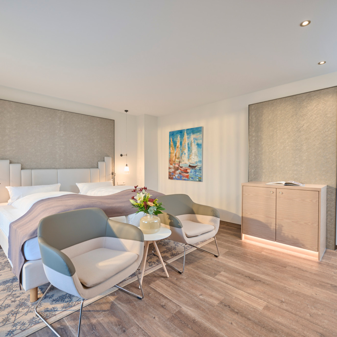 Kann es etwas Schöneres geben, als morgens die Balkontür zu öffnen und bei einer frischen Brise den Blick schweifen zu lassen? Unsere modernen, stilvoll eingerichteten Zimmer bieten Ihnen einen Blick auf Neuharlingersiel oder den Hafen, im DIEKhus sogar über das Wattenmeer bis hin zu den drei Inseln Langeoog, Spiekeroog und Wangerooge.
