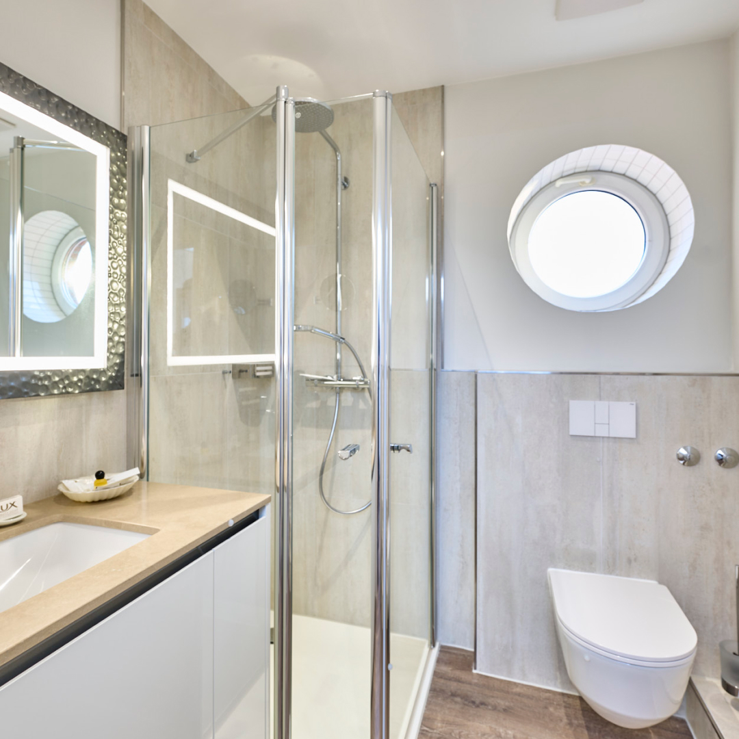 • Bad mit Dusche/WC, Haartrockner, beleuchtetem Spiegel und Schminkspiegel